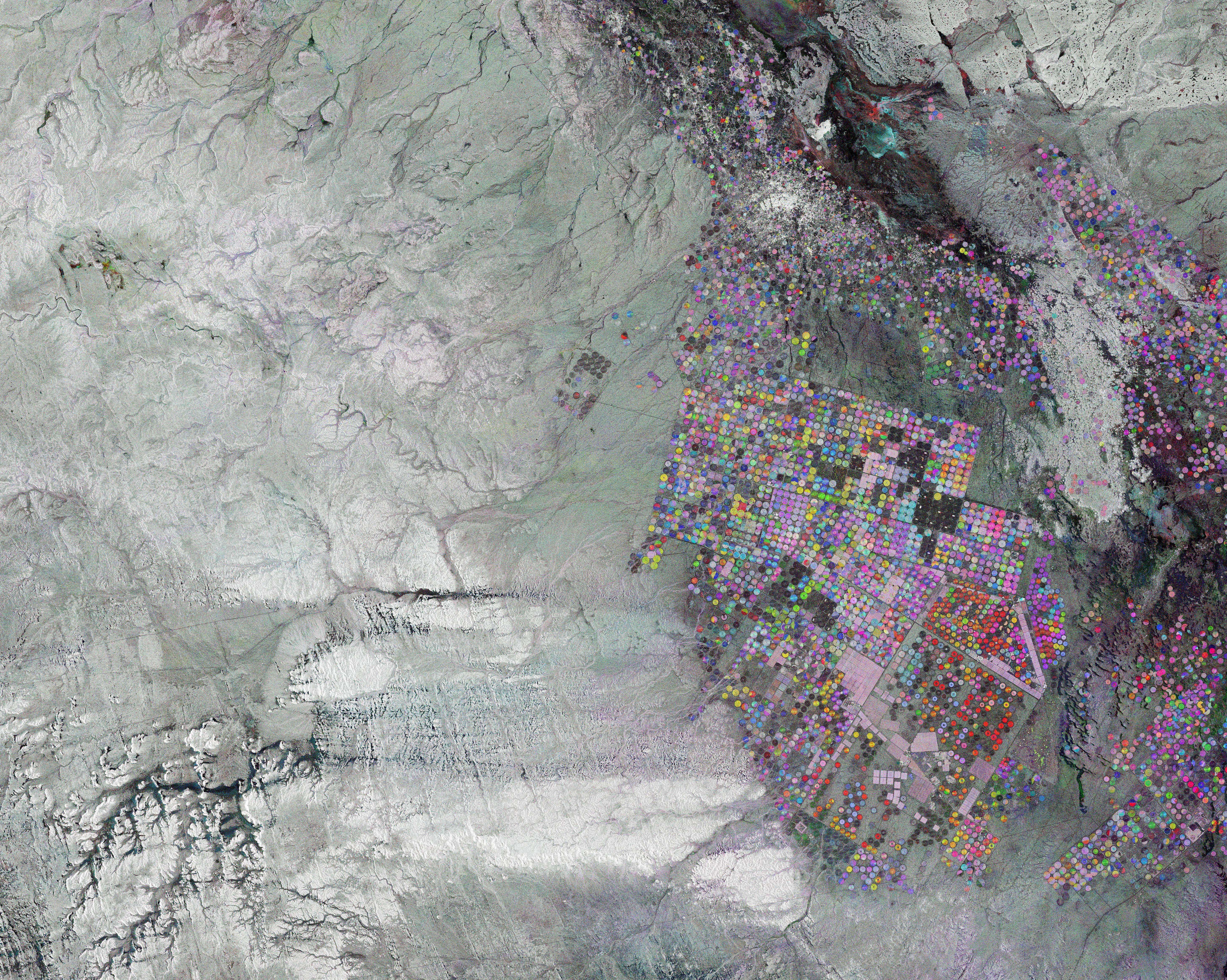 The circles, each approximately one kilometre wide, are formed by central-pivot irrigation systems. These consist of a well at the centre of each circle, which supplies water from underground aquifers to rotating sprinklers. This type of irrigation helps farmers manage water in a more sustainable way to conserve this precious resource, which is not being replenished."