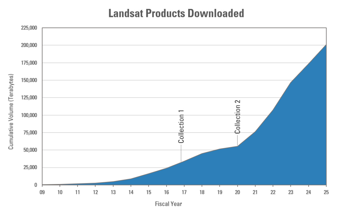 "On July 14, 2025, downloads of Landsat products passed 200,000 terabytes (TB). This milestone highlights the vast scale of the Landsat archive and growing demand for its data.