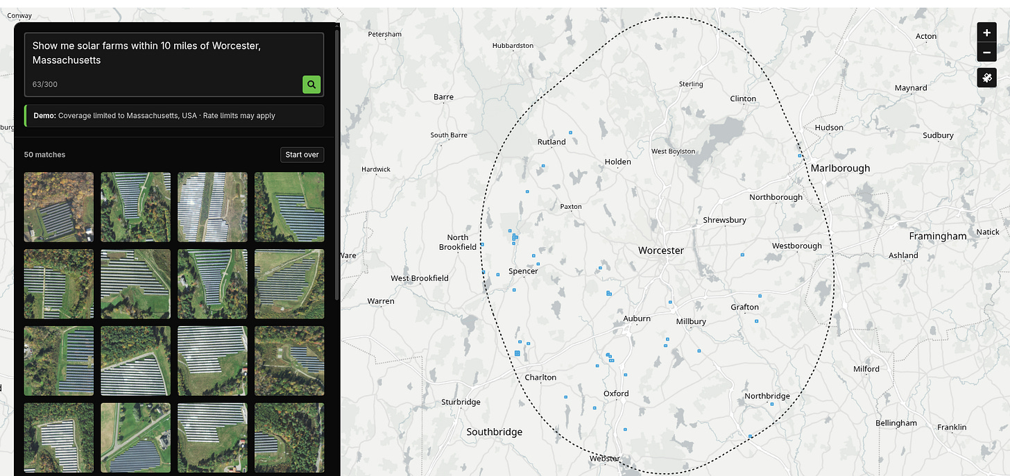 Element84 released Queryable Earth, a demo that showcases natural-language search across satellite imagery. Built on top of vision-language foundation models (VLMs) and LLMs, the system translates text queries, like “Find wetlands near Cape Cod”, into vector embeddings and matches them against pre-indexed satellite imagery of Massachusetts.