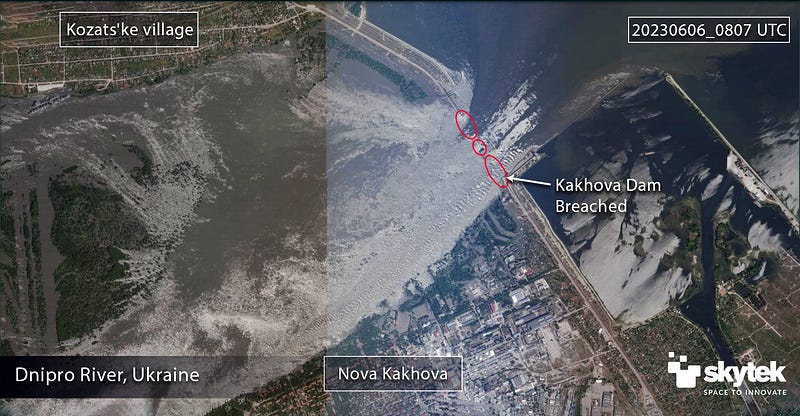 “Satellite imagery taken from Planet and analysed by Skytek indicate that a large explosion destroyed over 60% of the dam which is built 30m tall and 2,2 km long across Dnipro River, allowing the water contained in the Kakova Reservoir flow uncontrolled down river.”