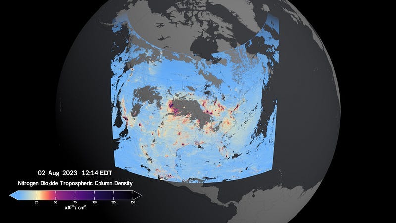 “The Tropospheric Emissions: Monitoring of Pollution (TEMPO) instrument collected its “first light” measurements of nitrogen dioxide air pollution over North America on August 2, 2023.