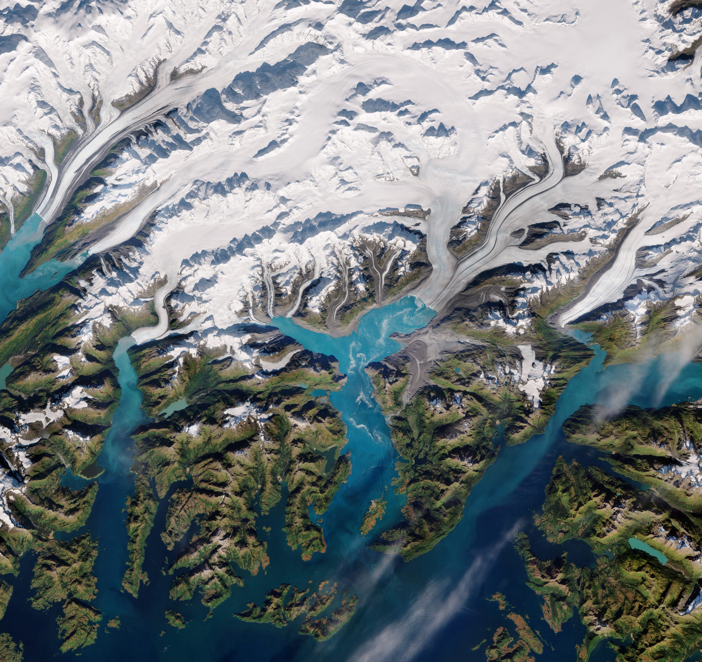 The Columbia Glacier, visible just above the middle of the image, is a tidewater glacier that flows down the snow-covered slopes of the Chugach Mountains, which dominate the upper part of the image. The mountains hold Alaska’s largest concentration of glacial ice.