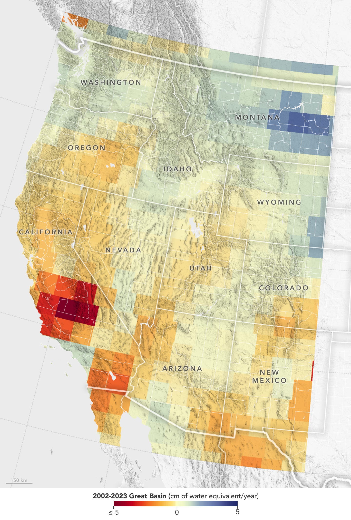 Declining water levels in the Great Salt Lake and Lake Mead have been testaments to a megadrought afflicting western North America since 2000. But surface water only accounts for a fraction of the Great Basin watershed that covers most of Nevada and large portions of California, Utah, and Oregon. Far more of the region’s water is underground. That has historically made it difficult to track the impact of droughts on the overall water content of the Great Basin.