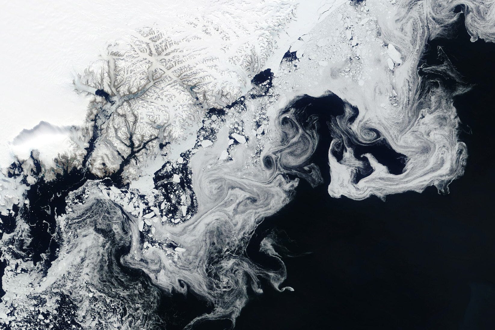"NASA's Terra satellite captured floating fragments of sea ice as ocean currents carried them south along Greenland's east coast on June 4, 2024.